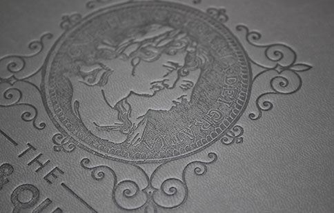 Esto funciona de la misma manera que el logotipo impreso de aluminio con la producción de una placa de impresión de latón, sin embargo, la lámina se deja fuera de la prensa de impresión y el calor de la placa va directamente a la cubierta que empuja el diseño al material. Esto le da al diseño una marca sutil que funciona mejor en los materiales de París, Roma, Washington y Saddle Hide debido a sus cualidades de marca de calor.